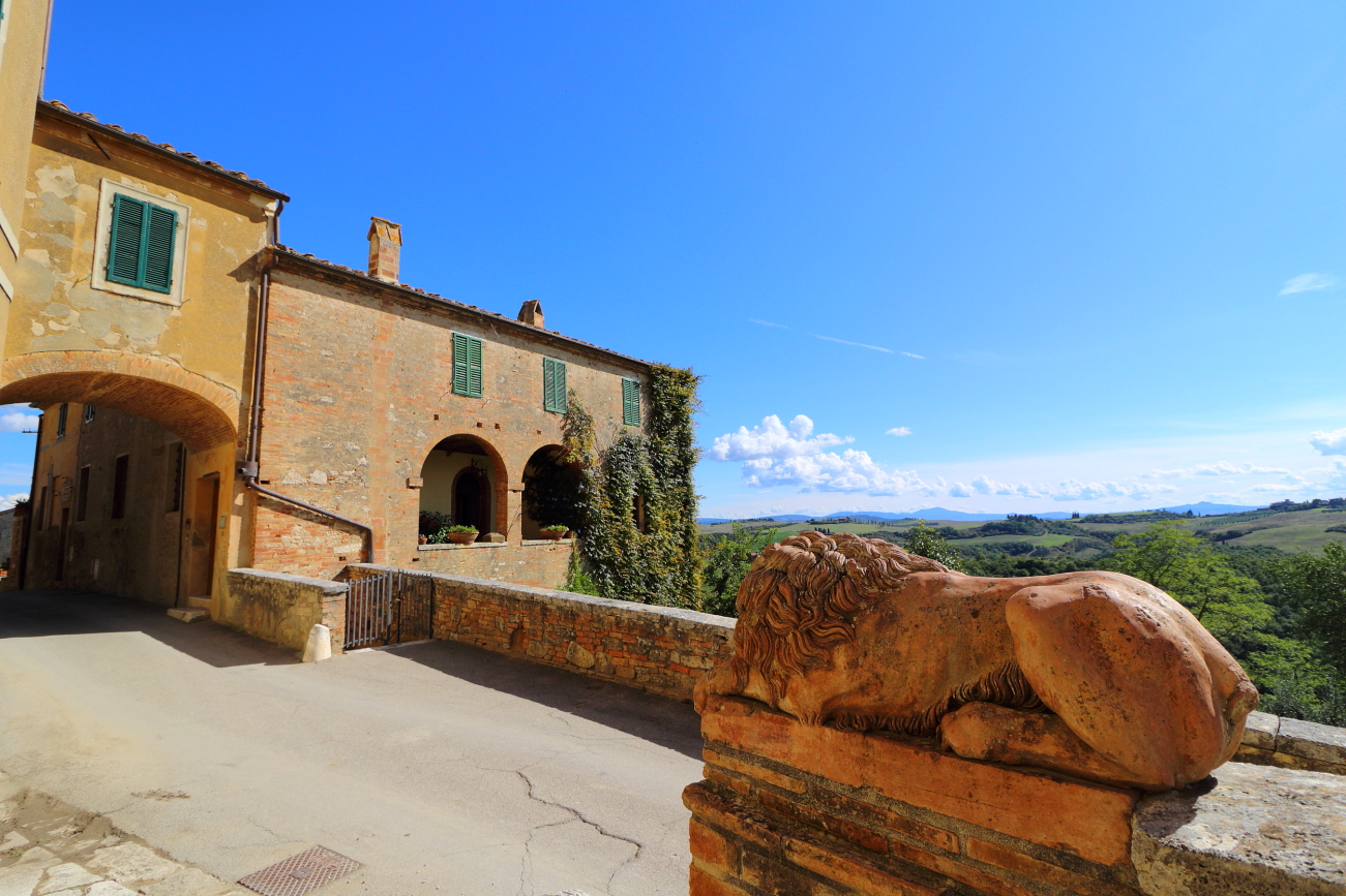 Pochi km più a sud di Montisi si attraversa CASTELMUZIO dove, prima di entrare in paese, suggerisco una piccola deviazione dalla strada principale, sulla destra quasi lungo una stretta stradina che conduce alla Pieve di Santo Stefano Cennano, l’ho trovata chiusa diverse volte sino a quando, al terzo tentativo, nel Luglio 2021 ho potuto accedere dall’ingresso laterale. Ripartiti dalla Pieve, in un paio di km si entra in CASTELMUZIO dove merita posteggiare la macchina ed addentrarsi nei vicoli del paesino sino alla terrazza panoramica da dove si apre un panorama che spazia da Montalcino comprendendo il Monastero di Sant’Anna di Camprena, il Monte Amiata e Pienza. Al centro del paese la strada si sdoppia: a Desta il Monastero di Sant’Anna, suggerisco di non perdere l’occasione di proseguire anche a sinistra PETROIO.