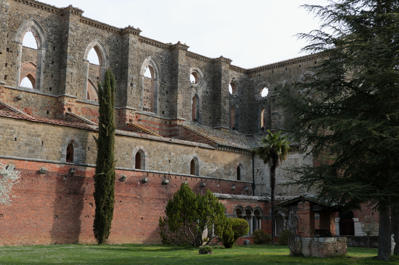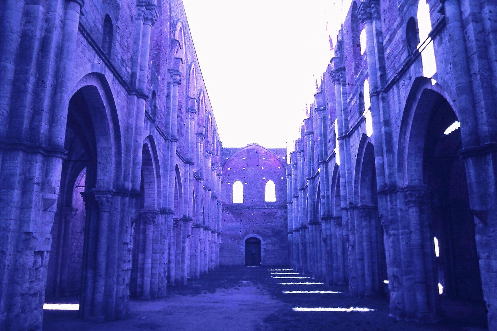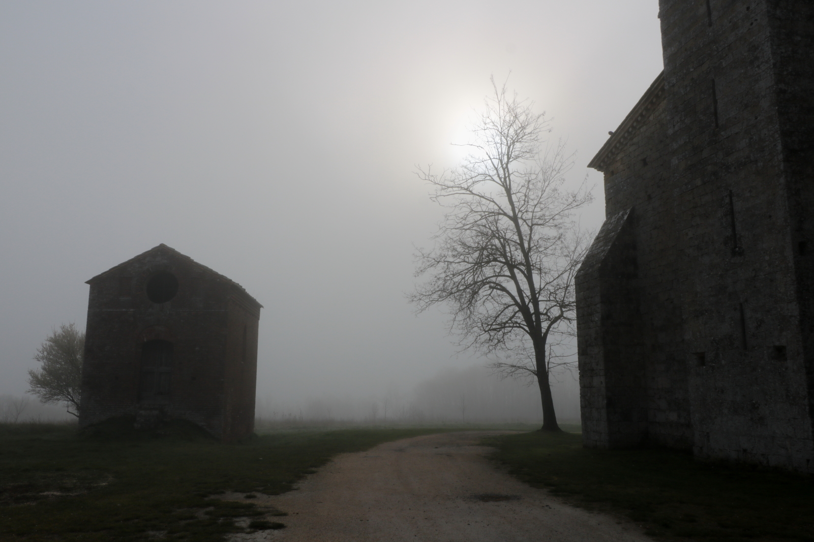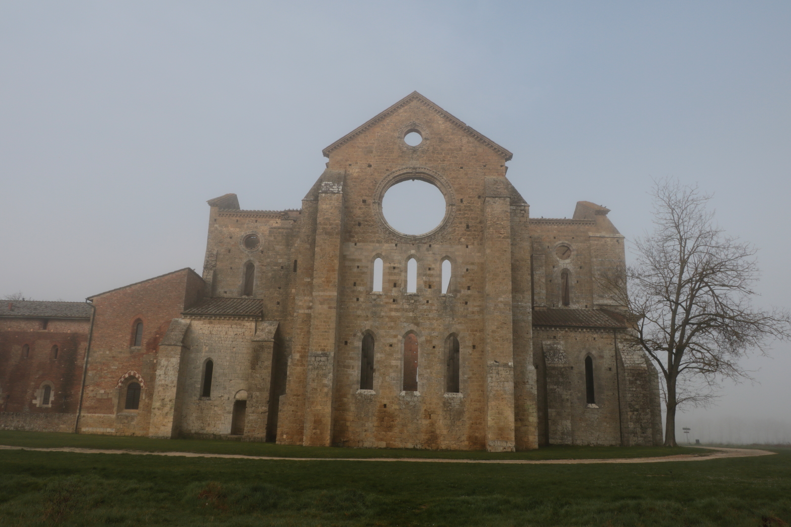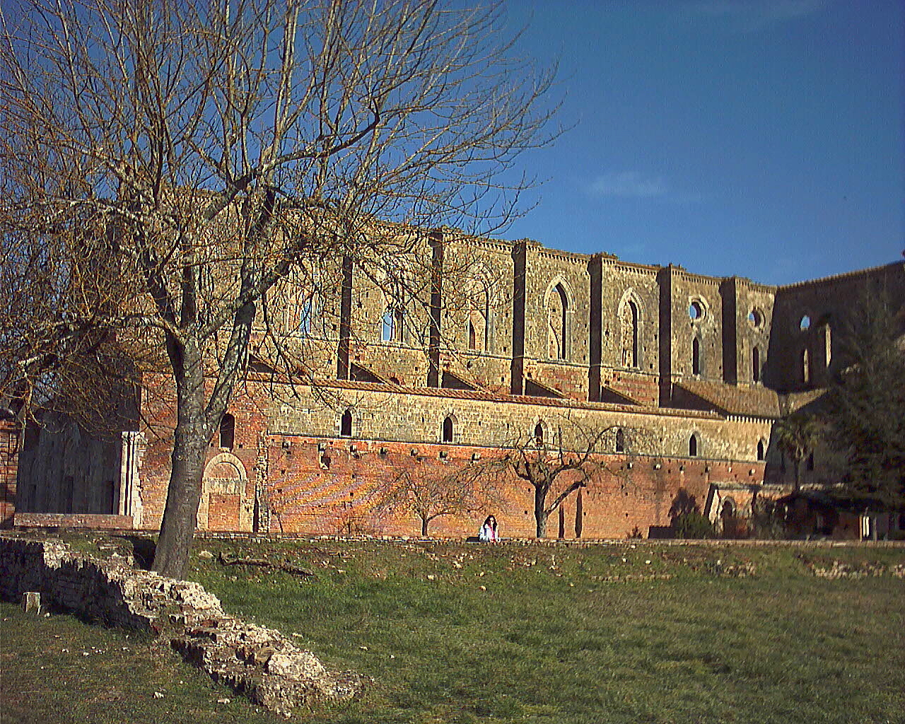 Il 27 dicembre del 1985 si sono stato per la prima volta. Avremmo trascorso il capodanno tra amici, a Firenze, ma non per questo lo ricordo la giornata, ricordo l’impressione, ascoltando alla radio al mattino, la notizia di un attentato all’aeroporto di Fiumicino; mi riportò la sensazione provata un anno prima, all’epoca eravamo li per qualche giorno prima di natale, quando un cameriere angosciato ci raccontò cos’era accaduto nella notte il 22.12.21984 al rapido 904 a distanza di un anno, notizie dello stesso tenore. Decidemmo di spegnere la radio. I due amici di Firenze ci descrissero SAN GALGANO la meta di quella giornata. Questo purtroppo è primo ricordo che associo a SAN GALGANO. Si trova a circa 35 km da Siena, se si percorre la SP73Bis. Sono i resti di una Abbazia Cistercense semidistrutta da un incendio poi abbandonata, sorge nel mezzo di uno spiazzo pianeggiante circondato da lievi colline. Nelle vicinanze l’Eremo di MONTE SIEPI con la sua “La Spada nella Roccia” e le Mani mozze, di chi avrebbe cercato di rubarla.
