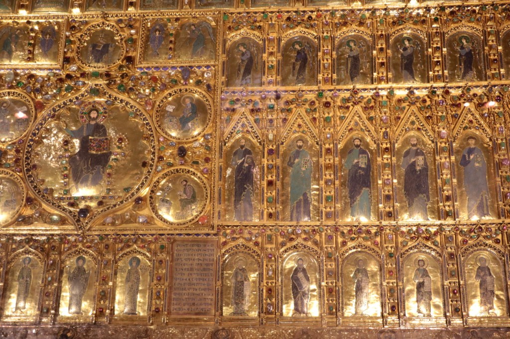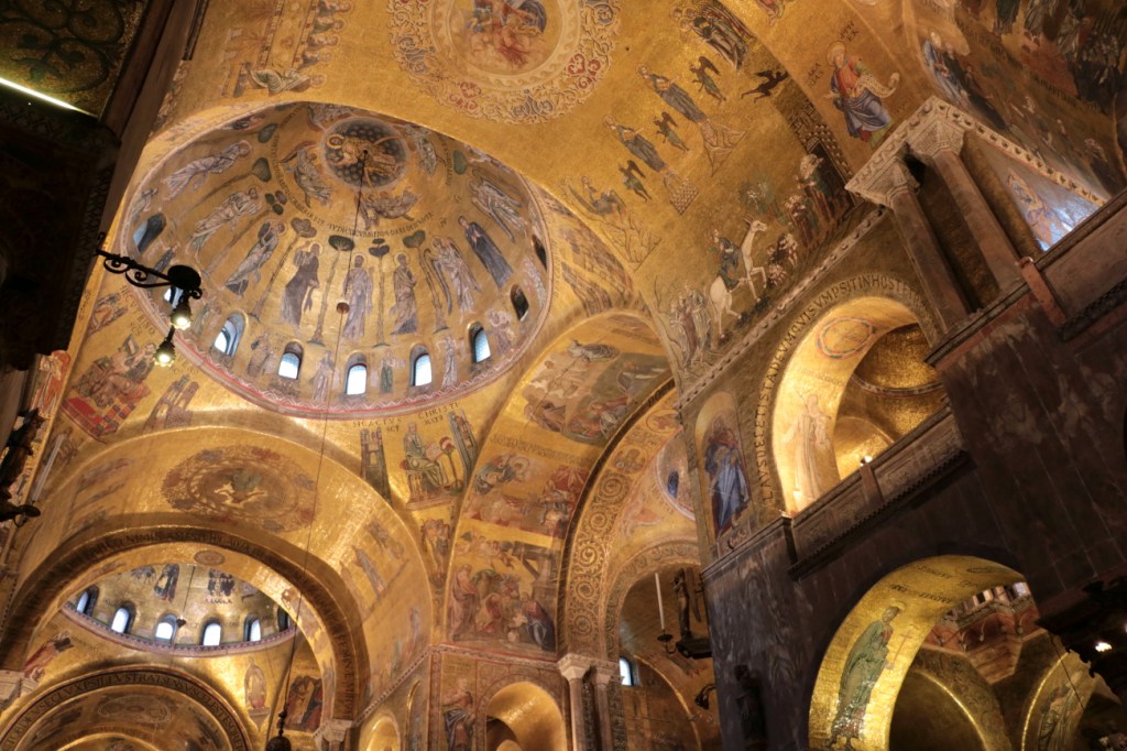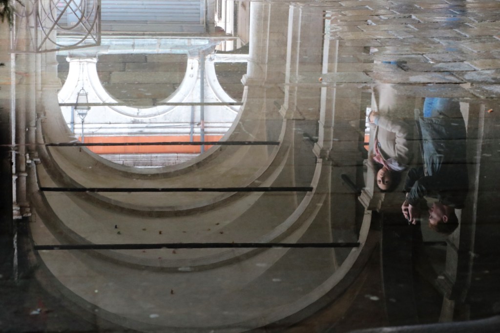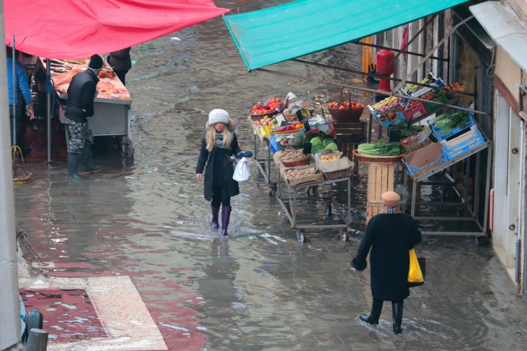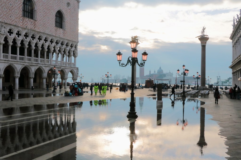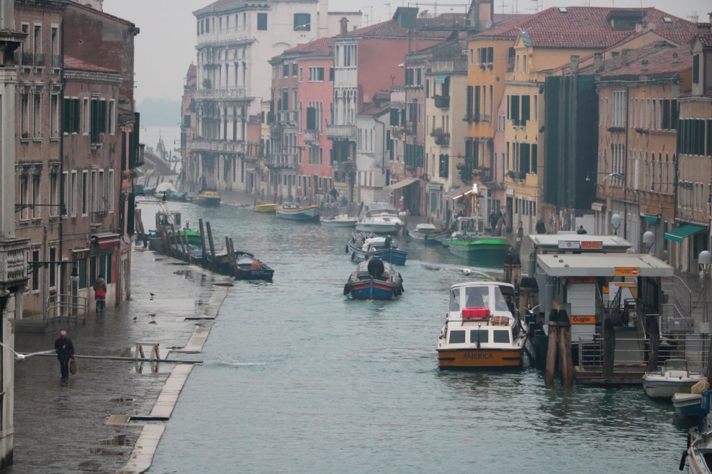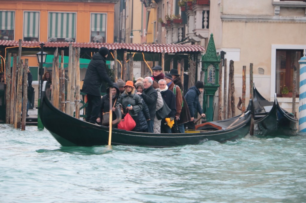 09.01 Sabato – Sogno le che cantano per me Sirene! Sento le Sirene ma non sembra più un canto! Apro gli occhi e sento ancora le Sirene, mi lanciano un messaggio? Chiamano i marinai? No, è ACQUA ALTA! Mi affaccio alla terrazza incurante della pioggia e vedo che l’acqua ha coperto parte dei marciapiedi, le bancarelle sotto l’albergo sembrano a pelo d’acqua, calerà più tardi, intanto facciamo colazione! Raggiungiamo San Marcuola percorrendo una passerella e ci imbarchiamo alla volta del Mercato dove sguazziamo tra le pozzanghere prima di riprendere il vaporetto per San Marco. Il livello sta calando, il cielo schiarisce, l’effetto scenico dell’acqua ed i riflessi dei palazzi è particolare, ma avere l’acqua in casa è tutt’altro, lo sappiamo per esperienza diretta! Qui a Venezia però è diverso, ci convivono è frequente e, contrariamente a quello che è stato fatto a Rotterdam e San Pietroburgo, sull’estuario del Tamigi… qui sperperano, non i cittadini ovviamente. Prima che aumenti la ressa di turisti entriamo nella basilica, gia’ affollata. Anche in SAN MARCO e settata in modalità “Vietato Fotografare”. Forse, come per le scuse a “Galileo Galilei”, ci vorranno 500 anni dall’invenzione della fotografia prima che i tabù cadano… forse sono ottimista. Per ora facciamo quello che quasi tutti gli altri turisti fanno “Scattiamo comunque” …chi più chi meno. Forse un giorno capiranno che un turista medio paga volentieri 1 o 2 euro, talvolta anche di più, come “permesso di Fotografare” pur di avere il piacere di fare le “Proprie Fotografie” senza pretendere ceh acquisti quelle scattate da altri, sarebbe sufficente non utilizzare lampeggiatori; forse un giorno capiranno che sarebbe un’altra fonte di incasso …Forse! Fuori dall’Italia è una prassi, qui NO!